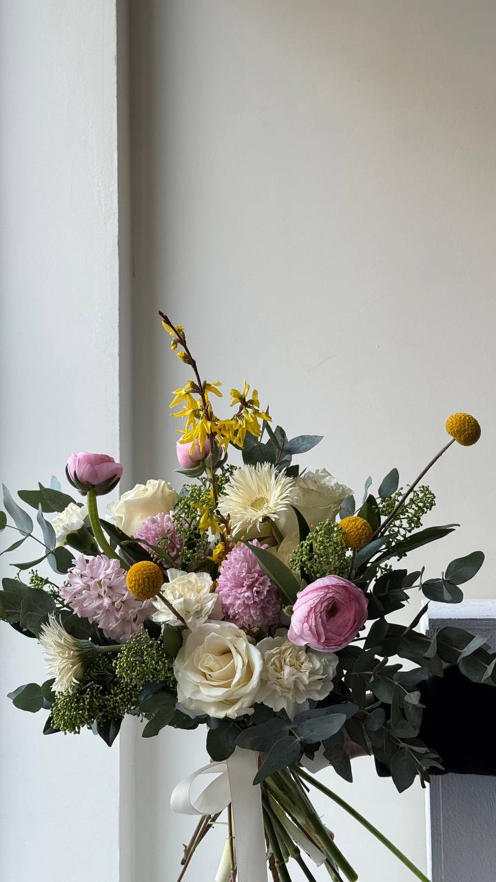 Ми створюємо унікальні букети з сезонних і екзотичних квітів під ваш привід. Букет може відрізнятися від фото, адже щотижня ми формуємо нові поєднання кольорів. У сезон використовуємо українські квіти.